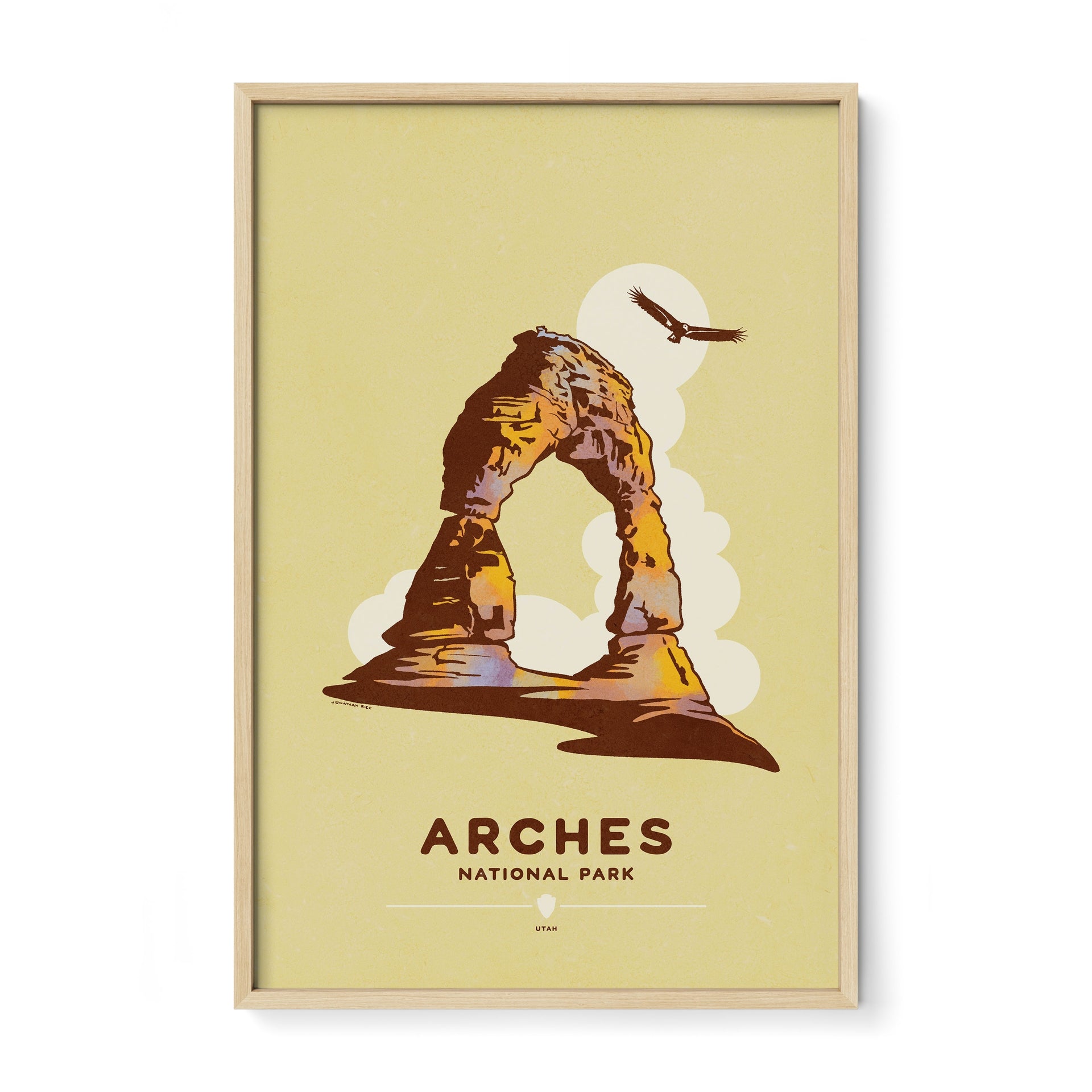 This illustrated poster captures the iconic landscape of Arches National Park, distilled into bold shapes, graphic forms, and a striking...