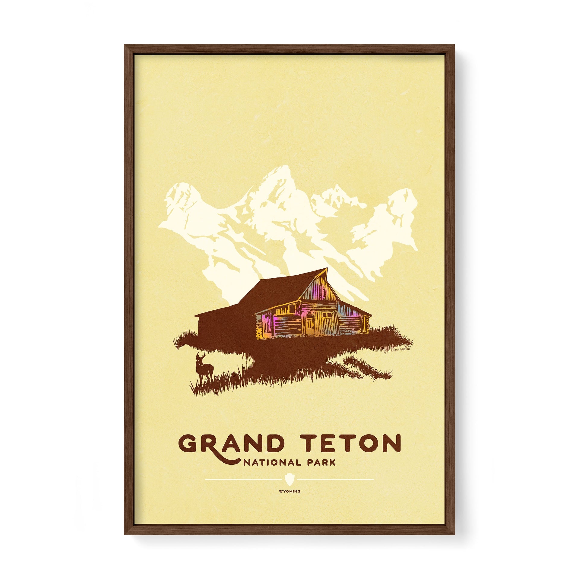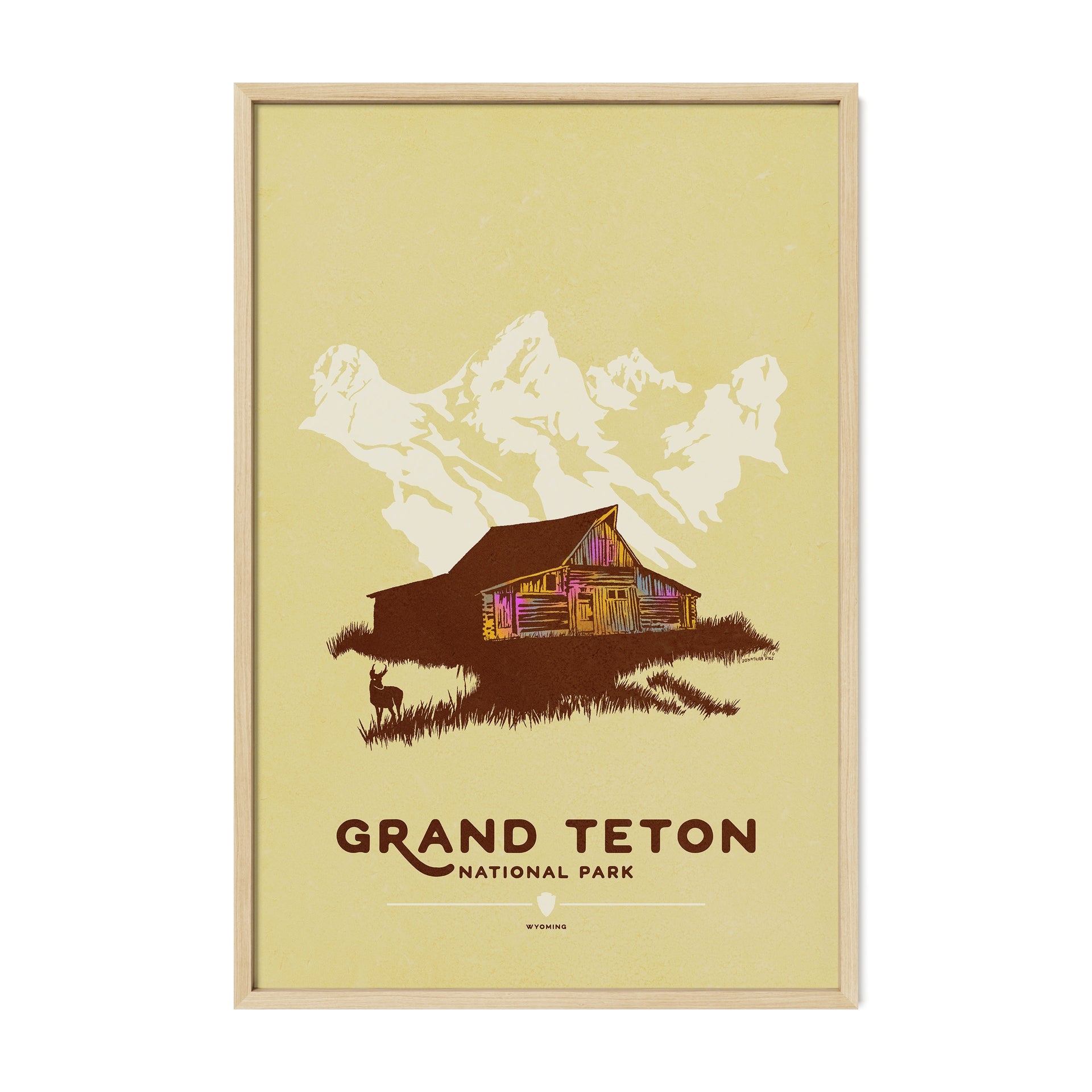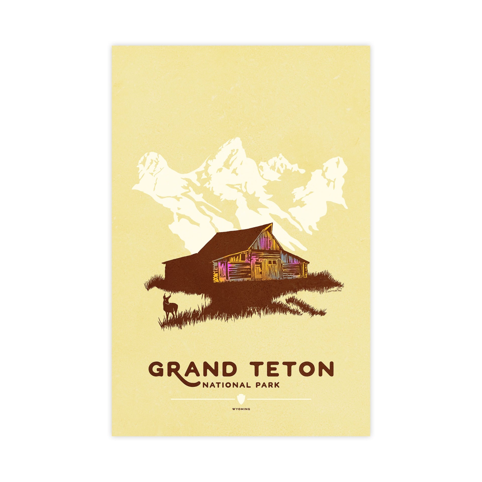 This illustrated poster features the iconic T.A. Moulton Barn set against the dramatic peaks of Grand Teton National Park, one...