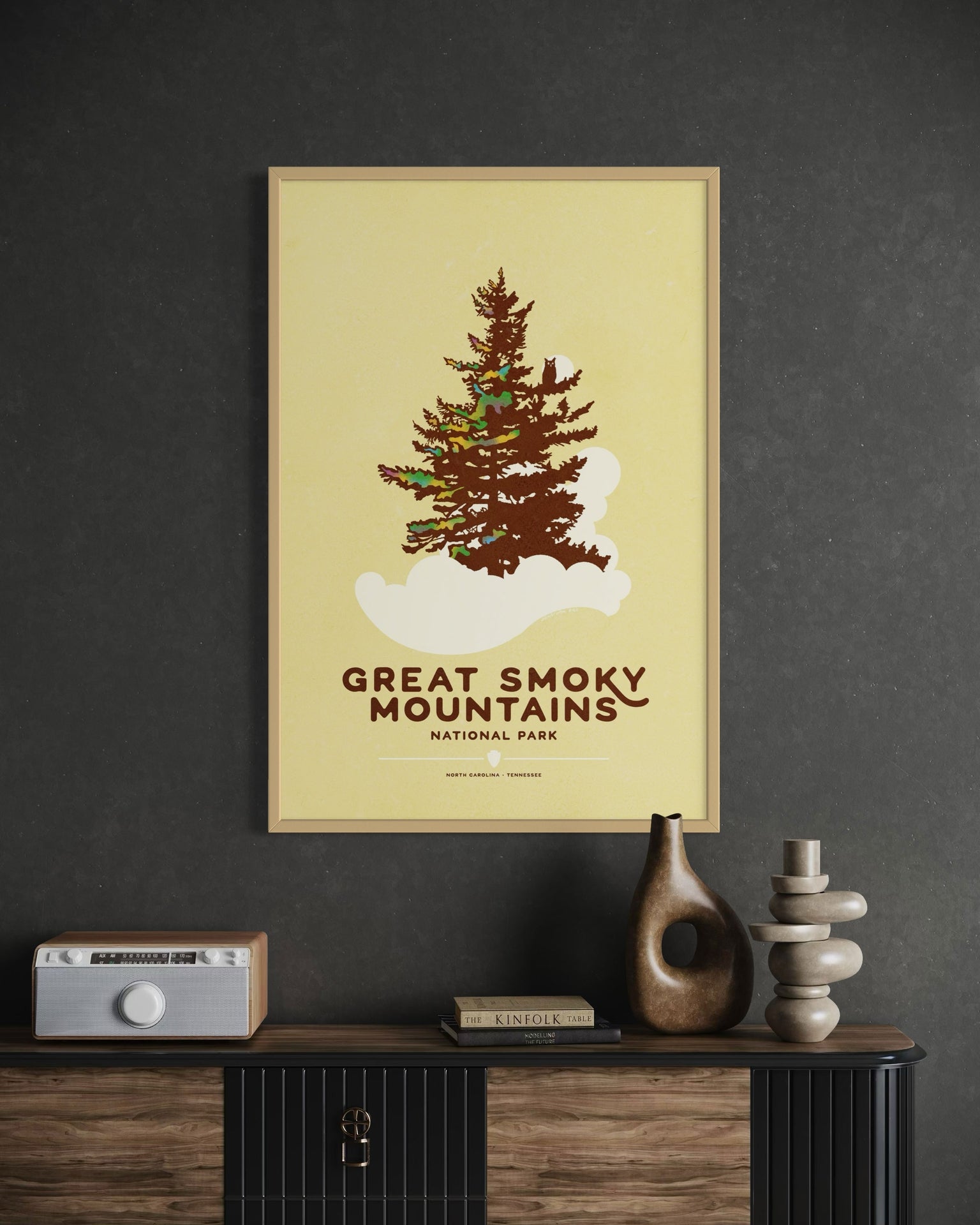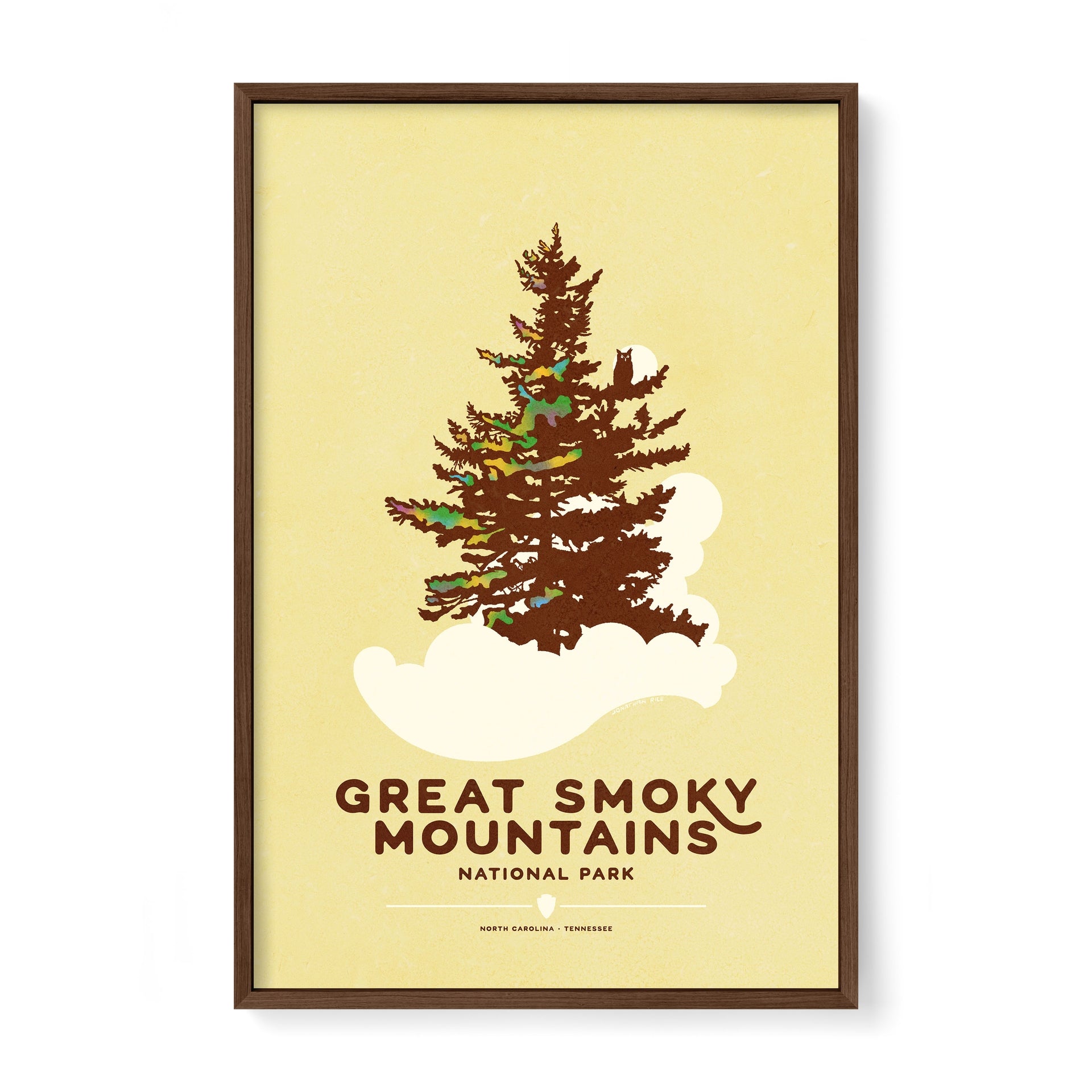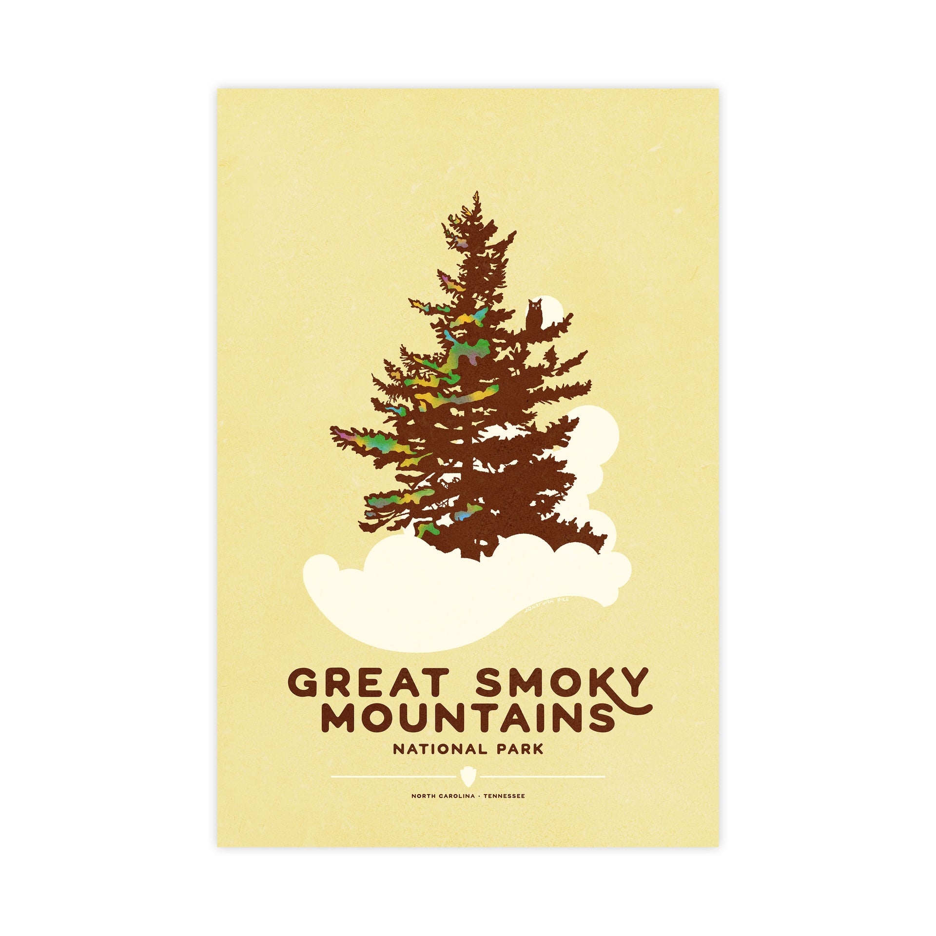 This illustrated poster captures the iconic landscape of Great Smoky Mountains National Park, distilled into bold shapes, graphic forms, and...
