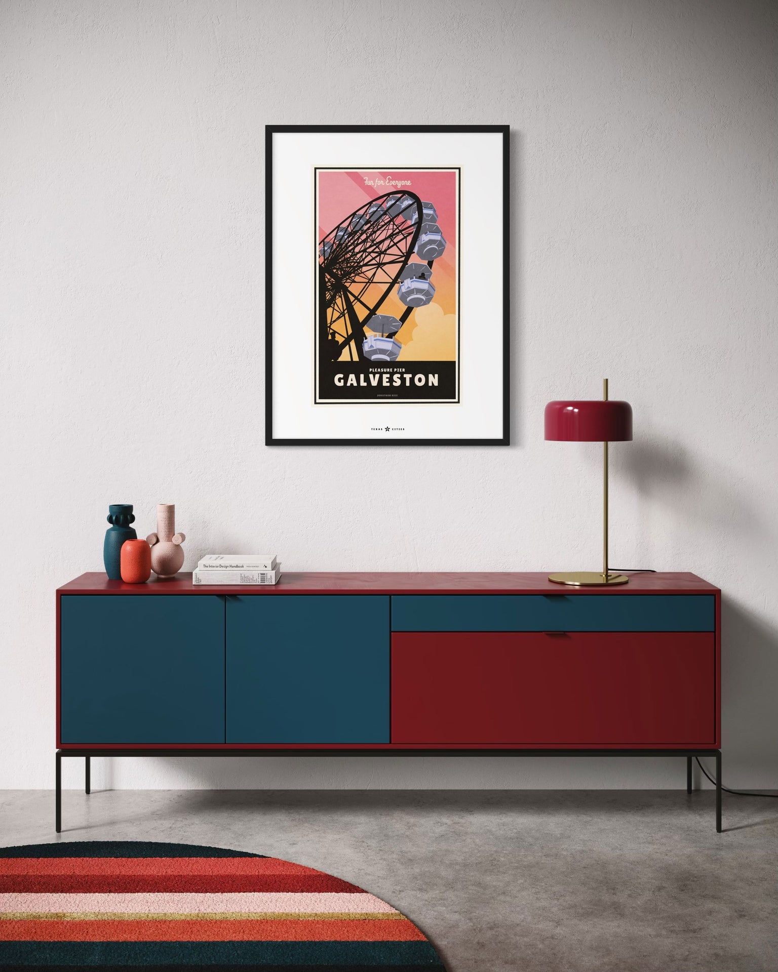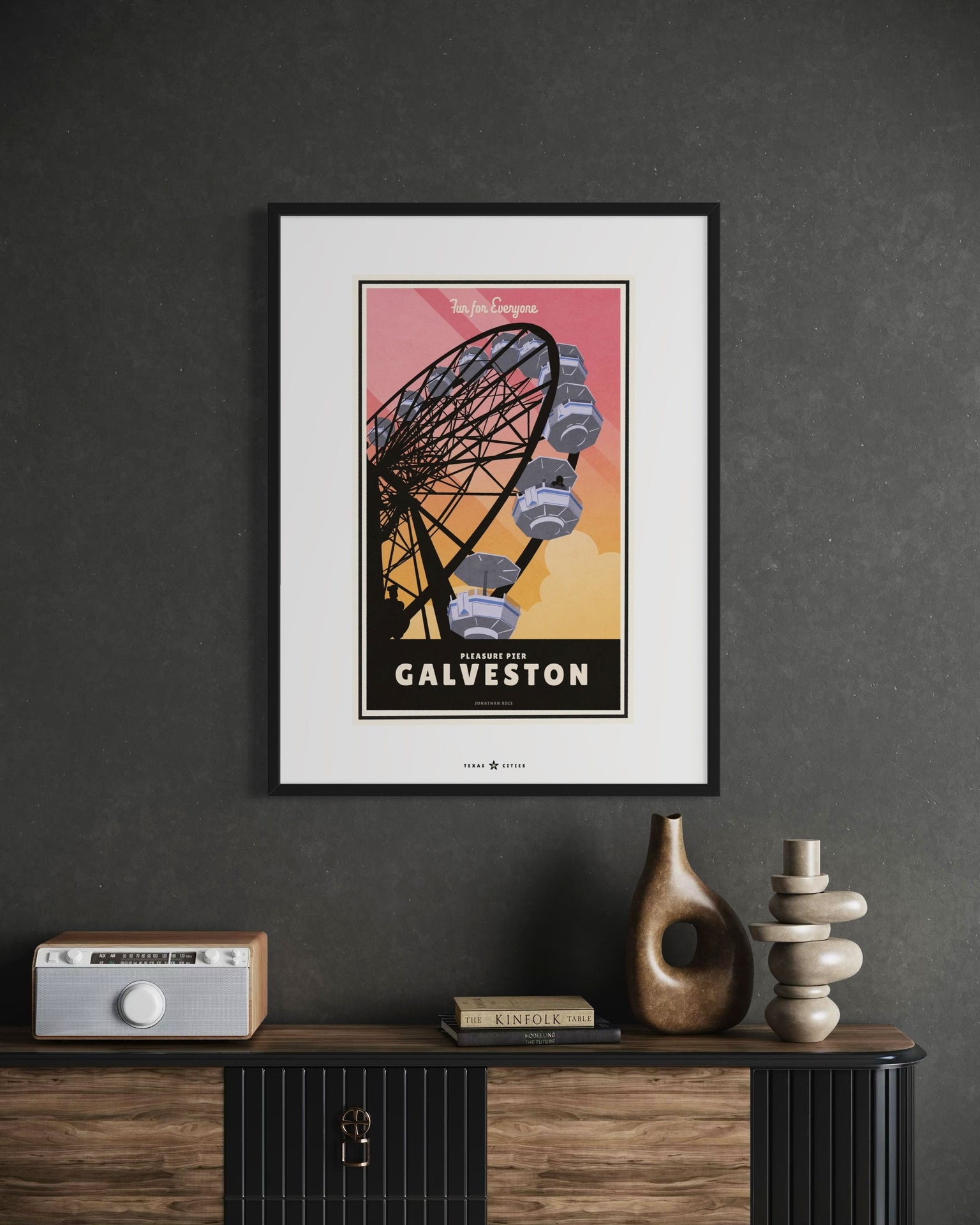 Capture the spirit of Galveston with this retro-inspired poster of the Pleasure Pier, where the Ferris wheel rises against a...