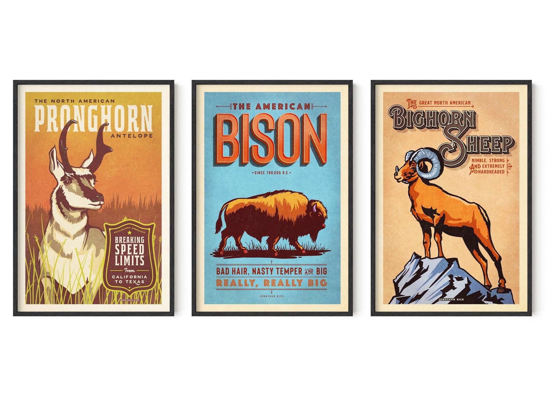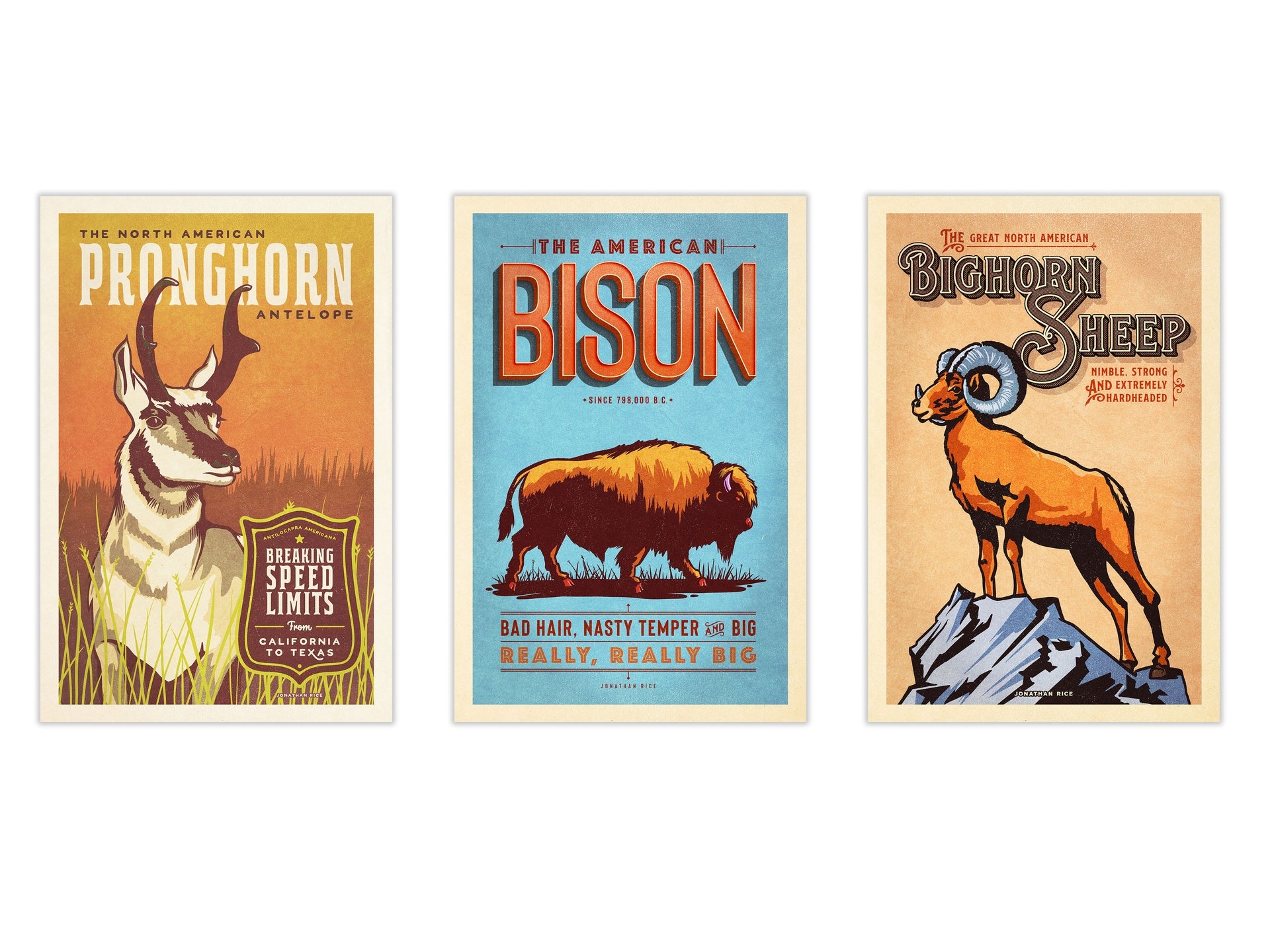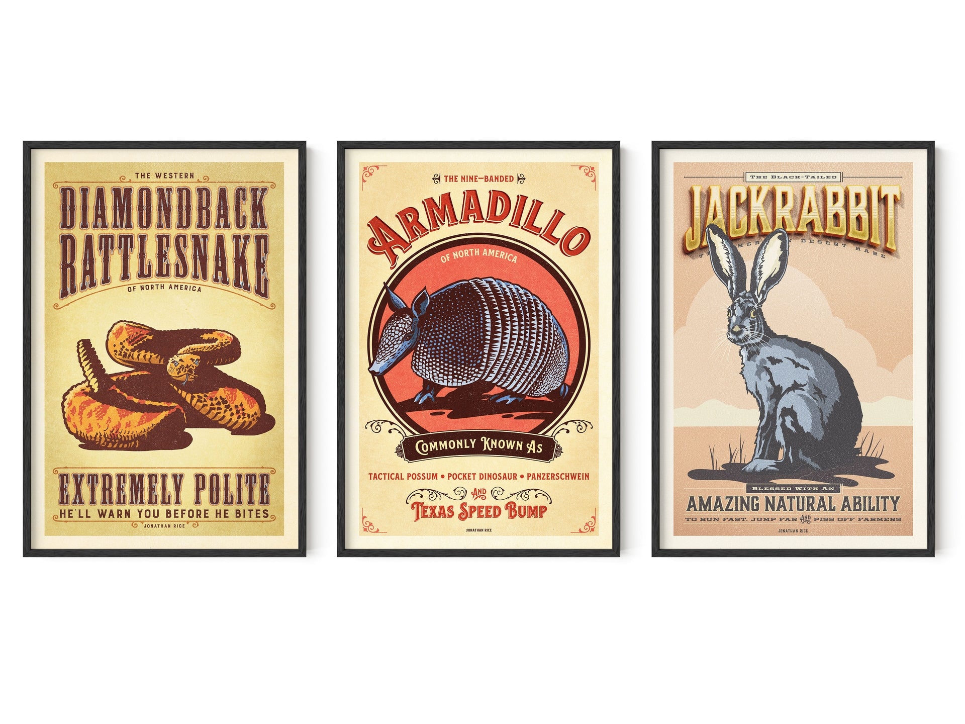 Gallery Series of Three • Fine Art Animal Posters Includes: • Diamondback Rattlesnake — Extremely Polite• Armadillo — Texas Speed...