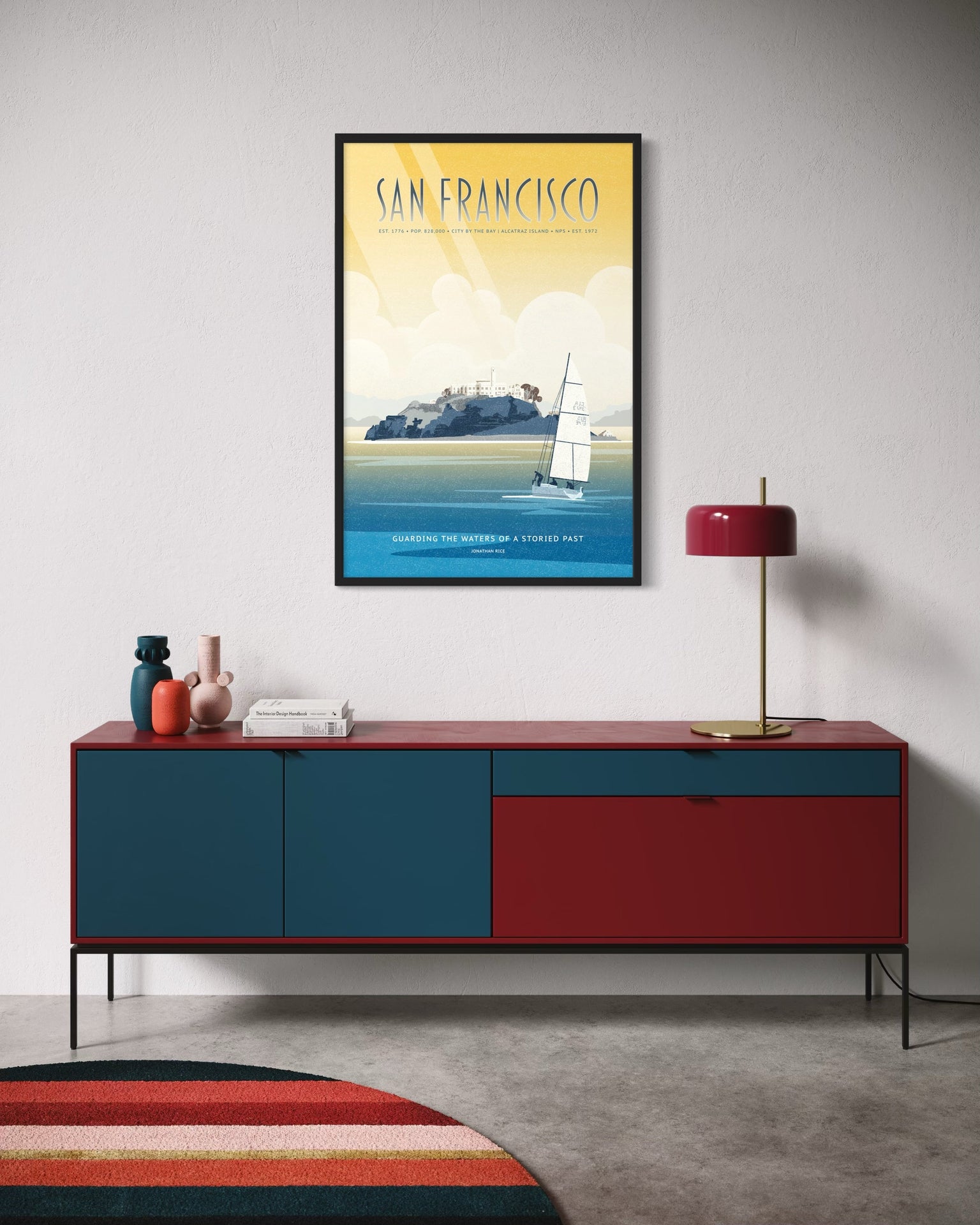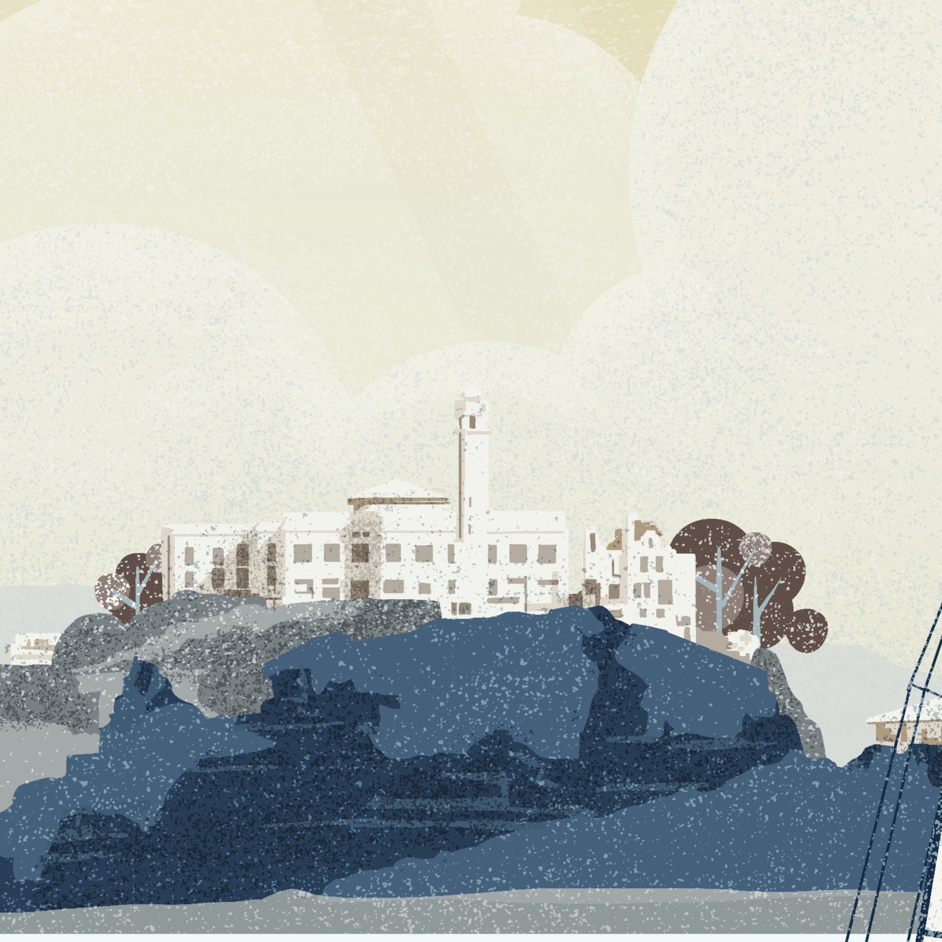 This illustrated poster celebrates Alcatraz Island, one of the most infamous and enduring landmarks of San Francisco. Rising from the...
